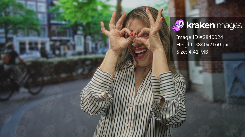 Blonde woman wearing striped shirt and eyeglasses makes hand binoculars gesture on busy city street; playfulness.