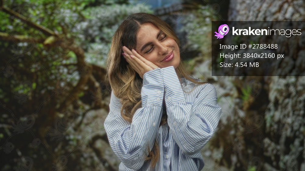 Blonde woman wearing striped shirt places hands for sleep gesture beside mossy tree in forest; restful dream.