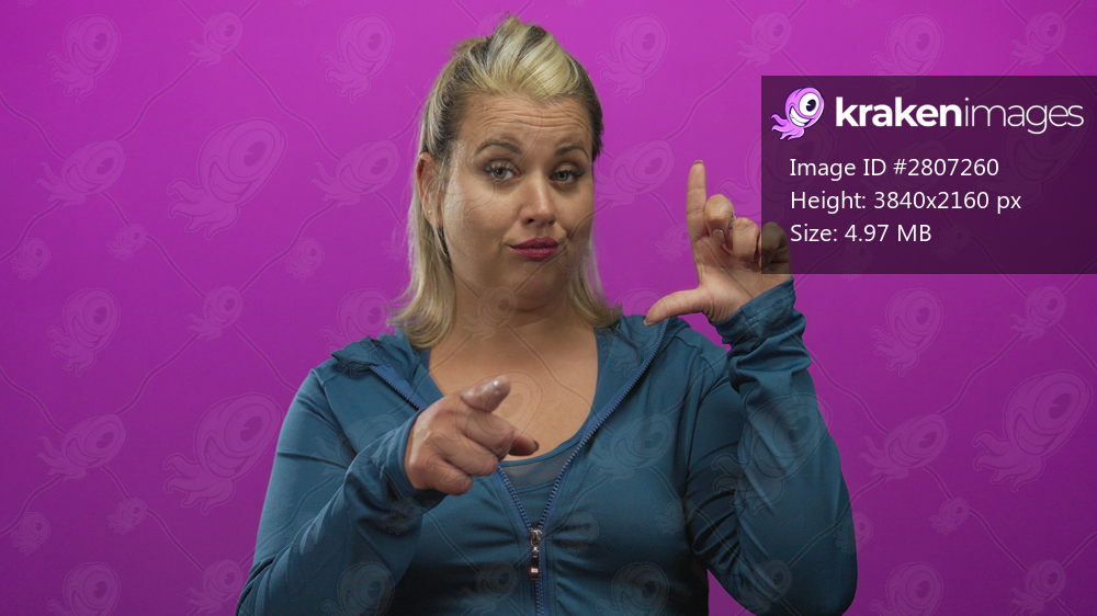 Blonde woman wearing teal jacket makes l shape with finger by head and points hand in purple studio; confident attitude.