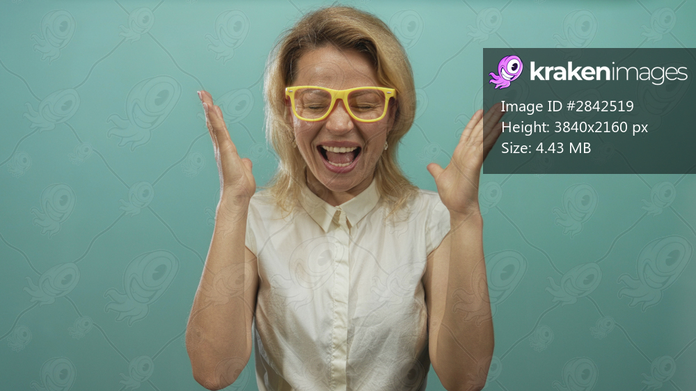 Blonde woman wearing yellow glasses clenches fists in teal studio; excitement celebration joy confidence.