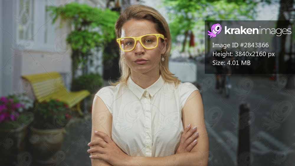 Blonde woman wearing yellow glasses and sleeveless blouse stands with arms crossed on bustling city street; confidence determination resilience strength.