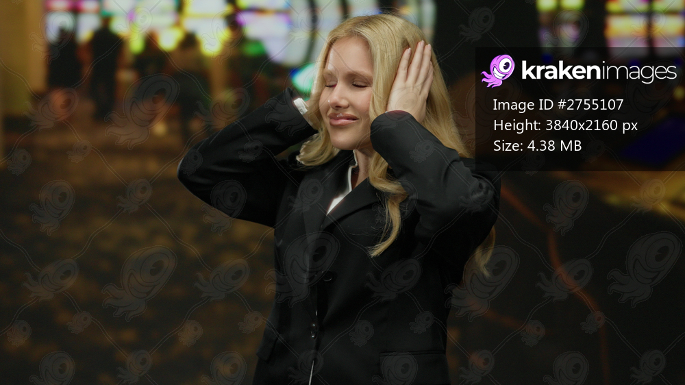 Blonde young woman covering ears in a vibrant casino setting with a serious expression, surrounded by colorful gaming machines and an energetic atmosphere. - Kraken Images