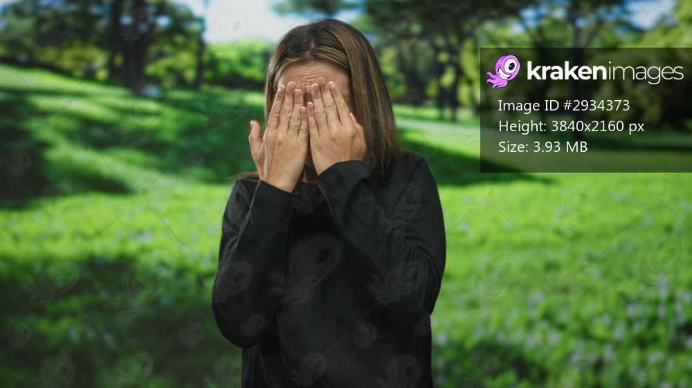 Blonde young woman covering eyes with hands and wiping tears in a sunlit green park with trees and grass; private sadness.