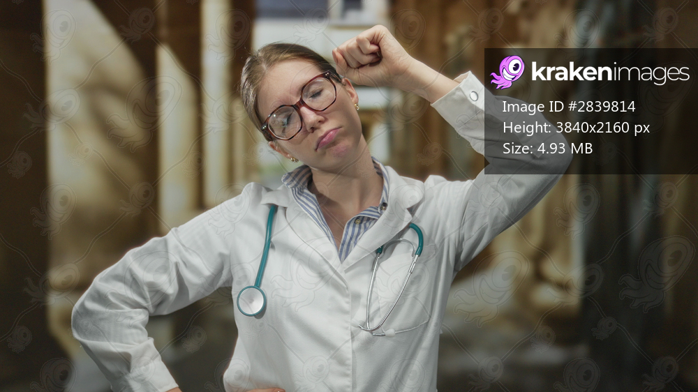 Blonde young woman doctor presses fist to temple while wearing a stethoscope on a cobblestone street; stress.