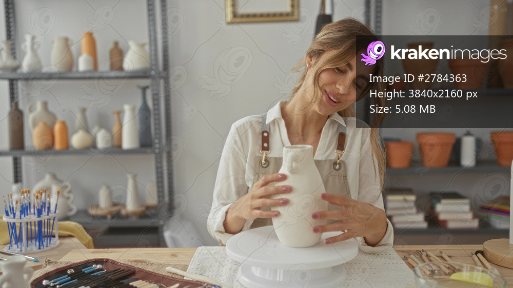 Blonde young woman examines ceramic vase on rotating pottery wheel in studio; creativity craftsmanship focus.