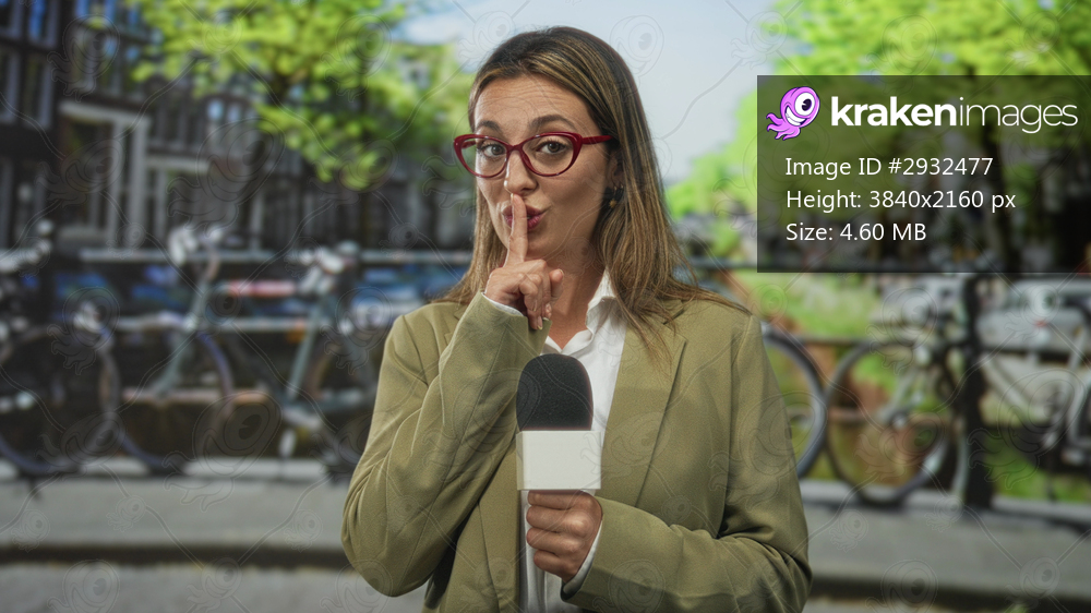 Blonde young woman holding microphone, finger to lips for silence on street in amsterdam wearing blazer and red glasses during on camera report; secrecy. - Kraken Images
