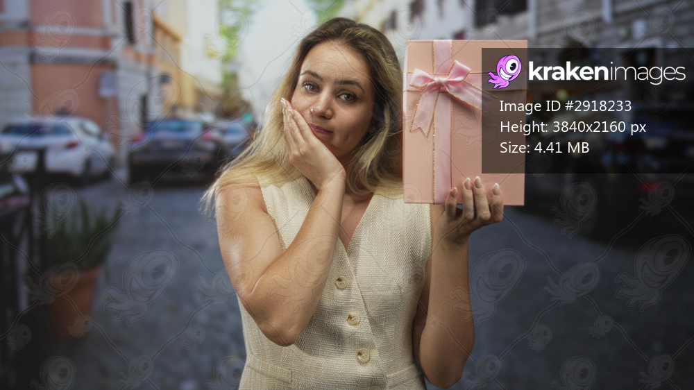 Blonde young woman holding pink present with raised hand and folded arm on cobblestone street in city; indifference gift reaction.