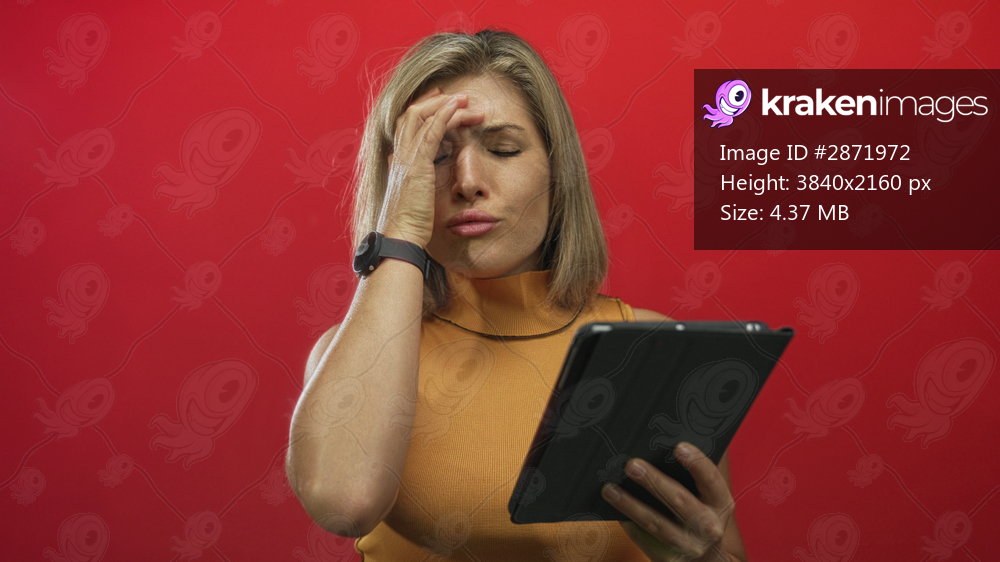 Blonde young woman holding tablet, hand to forehead and raised palm while reading screen in studio with red wall; surprise.