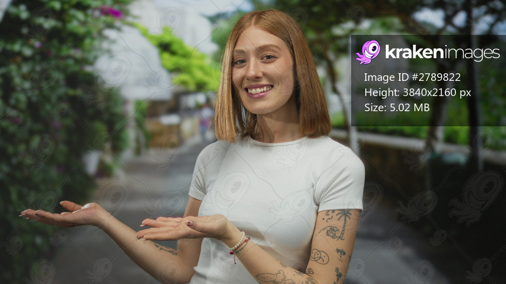 Blonde young woman holds open palms at eye level in a leafy urban park; invitation engagement warmth.