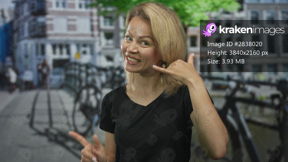 Blonde young woman in black t shirt performs call gesture and smiles broadly with hand to ear on street; playful social connection.