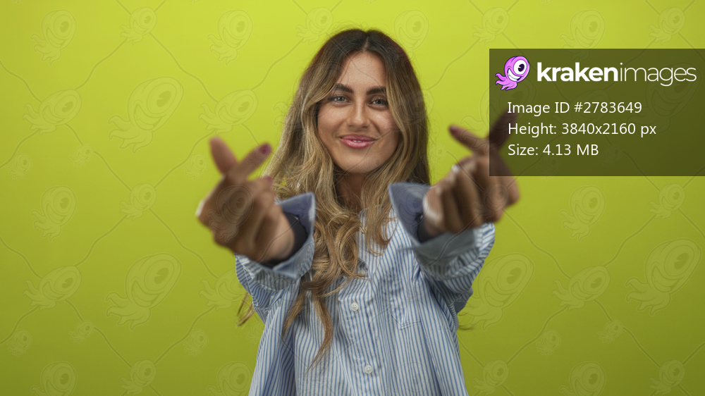 Blonde young woman makes heart gesture with her hands in yellow studio; love affection romance happiness.