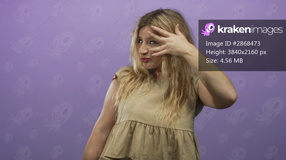Blonde young woman peeks through fingers while covering face with hand in studio with purple backdrop; shyness curiosity.