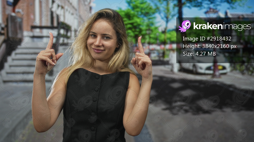 Blonde young woman points both index fingers upward on sunny city street beside building steps and parked car, wearing black sleeveless dress; playful confidence. - Kraken Images