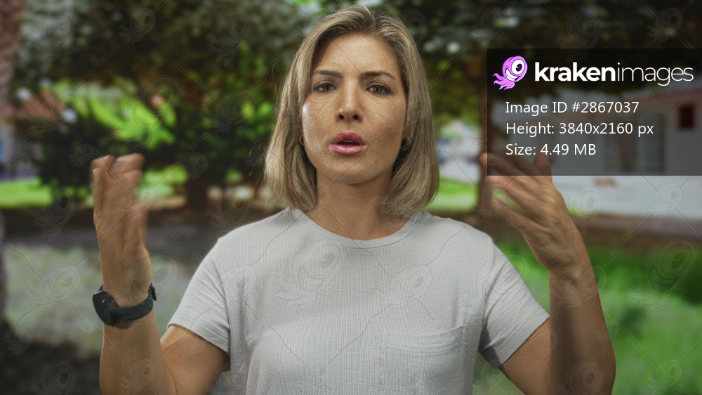 Blonde young woman repeatedly fans face with hands beside building in green park outdoors on a warm day; cooling relief.