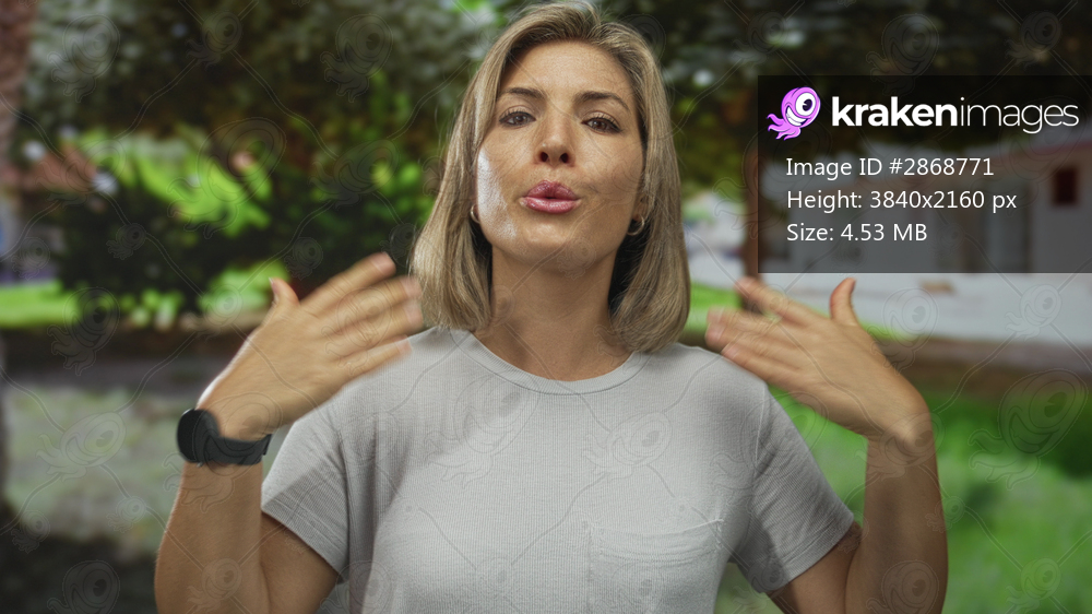 Blonde young woman repeatedly fans face with hands beside building in green park outdoors on a warm day; cooling relief.