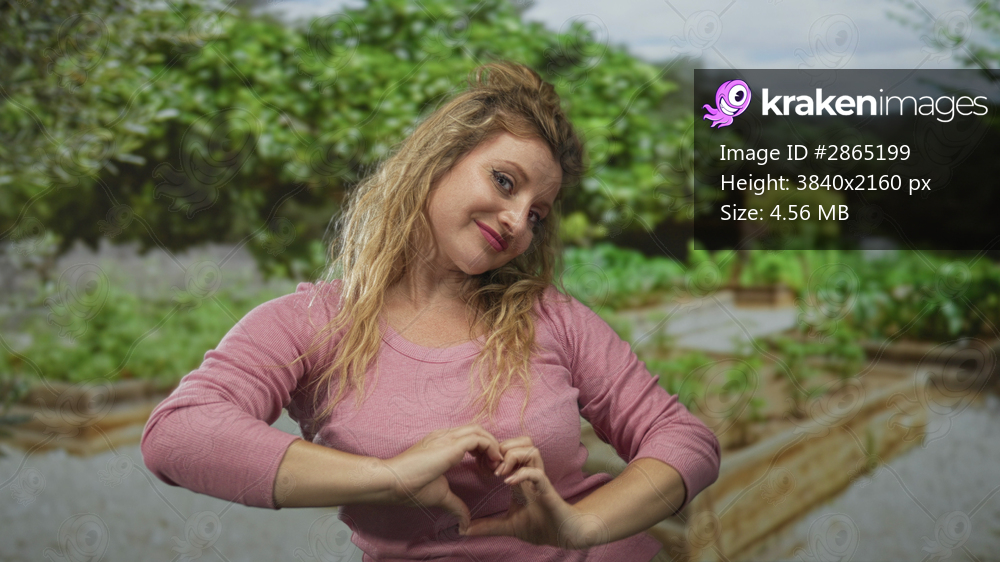 Blonde young woman smiling and forming heart with hands while wearing pink sweater in forest garden with beds and green foliage; affection.