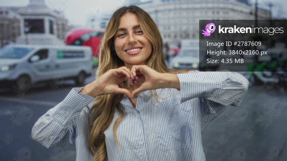 Blonde young woman smiling while forming heart shape with fingers at busy city street; love affection joy friendship.