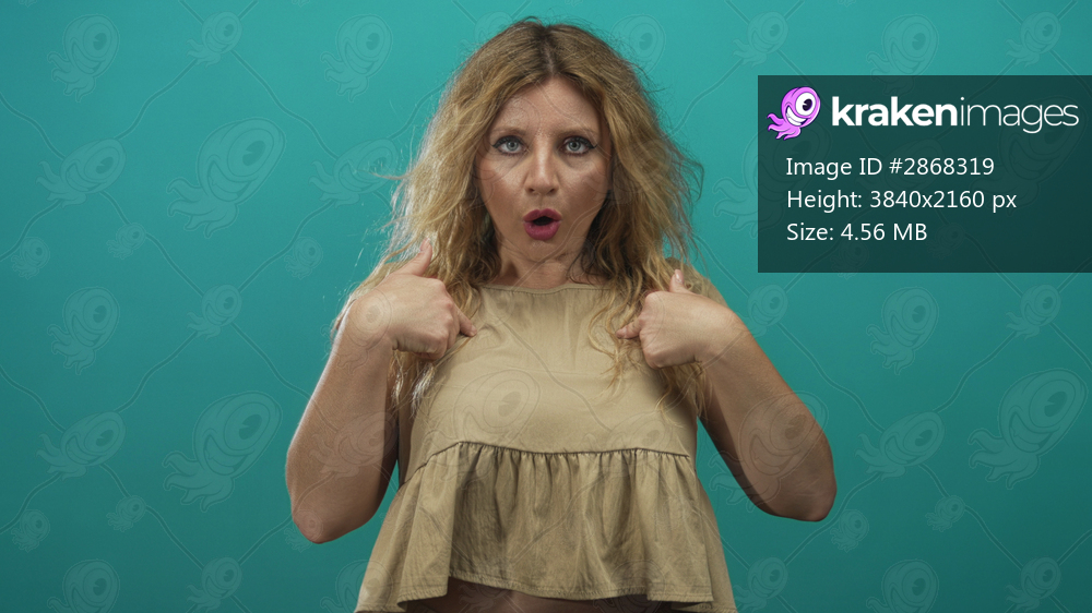Blonde young woman with thumbs pointing to chest and direct gaze standing in teal studio; surprise confidence resilience.
