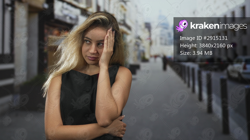 Blonde young woman touching cheek with her hand in a black sleeveless dress, standing on a street with bollards and blurred cars; thoughtful reflection. - Kraken Images