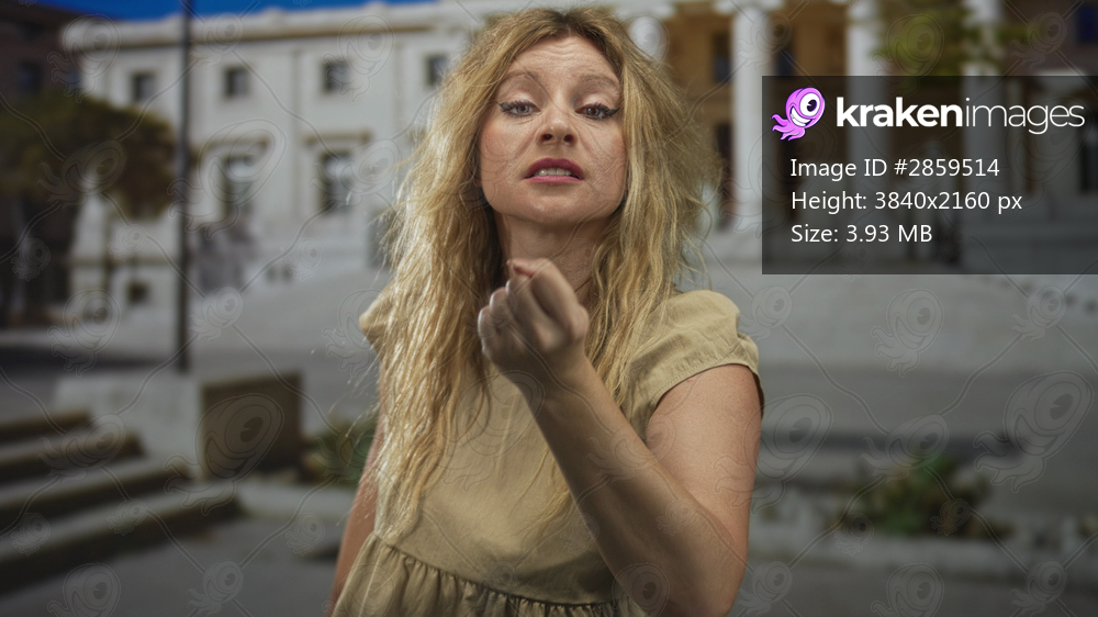 Blonde young woman with tousled hair beckons with hand toward camera in front of neoclassical building steps; anger confrontation insistence.