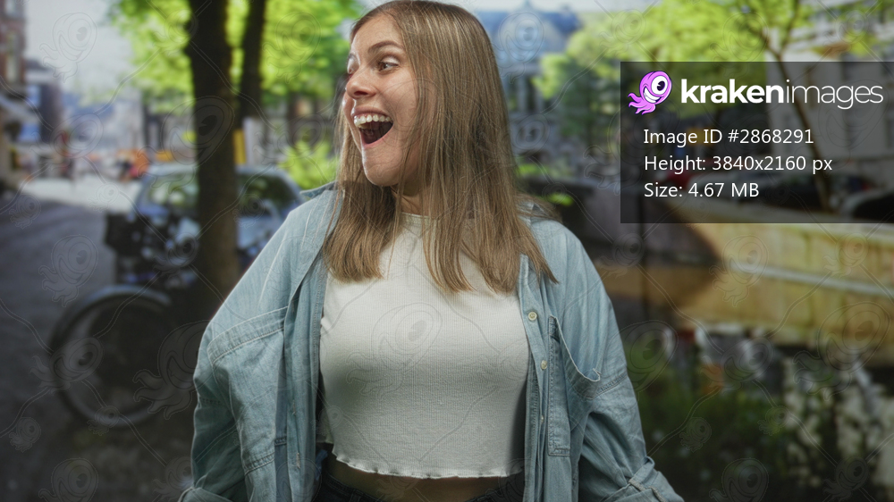 Blonde young woman wearing denim shirt and crop top with open palms on sunlit street; pure amazement.