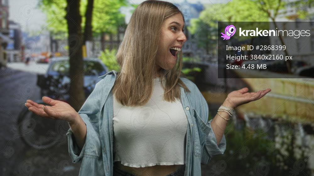 Blonde young woman wearing denim shirt and crop top with open palms on sunlit street; pure amazement.