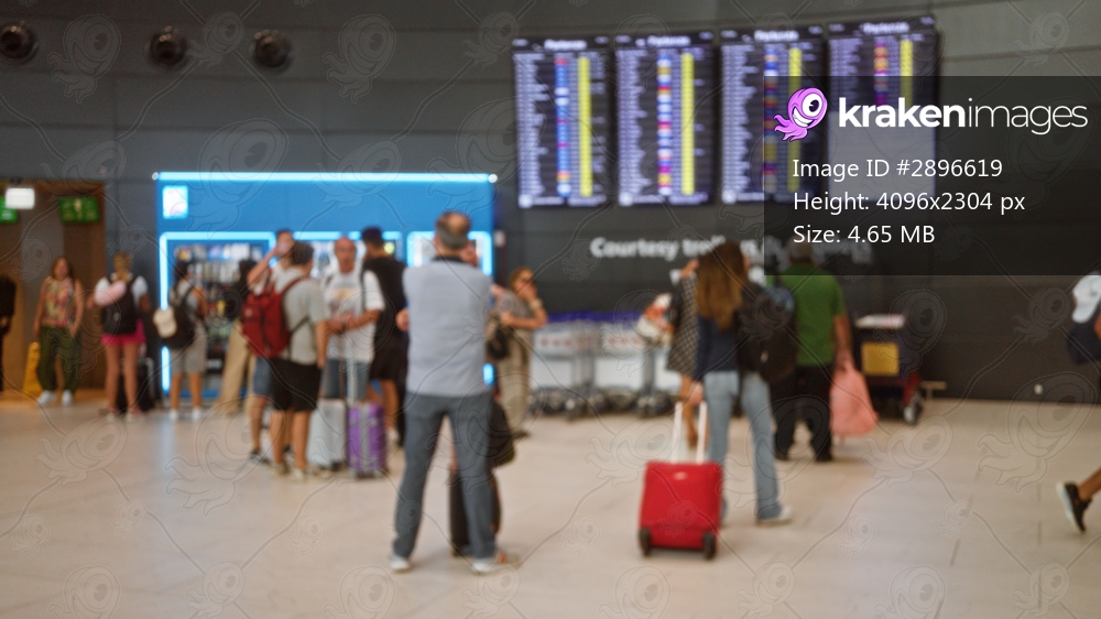 Blurred airport terminal background with defocused flight boards and luggage in interior; background backplate copyspace template calm.
