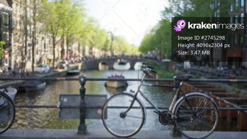 Blurred bicycle on amsterdam canal bridge with defocused background highlighting trees and historic architecture under bright daylight.