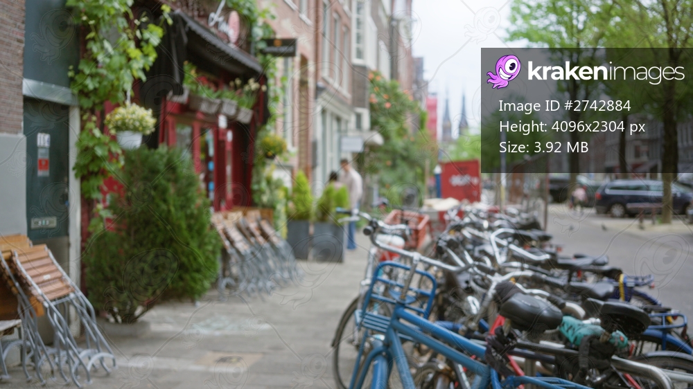 Blurred bicycles line a charming amsterdam street with vibrant shops and greenery, capturing the essence of urban life in the netherlands.