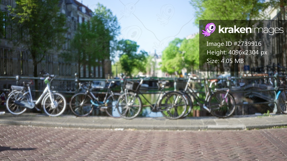 Blurred bicycles lined along amsterdam canal with vibrant green trees and historic architecture in the background, creating a serene and picturesque urban scene - Kraken Images