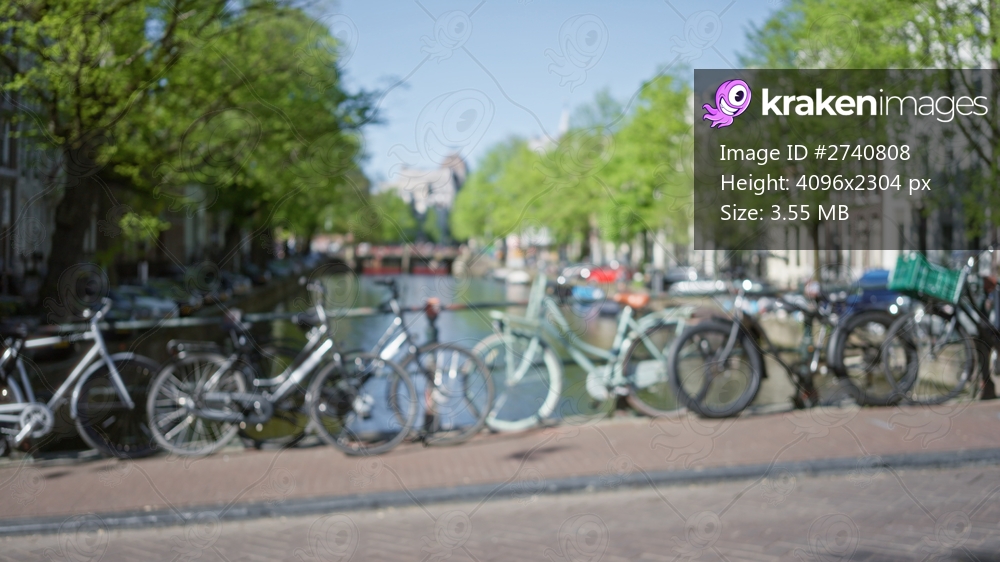 Blurred bikes line a scenic amsterdam canal with lush green trees in the background, epitomizing a tranquil and picturesque urban setting in the netherlands. - Kraken Images