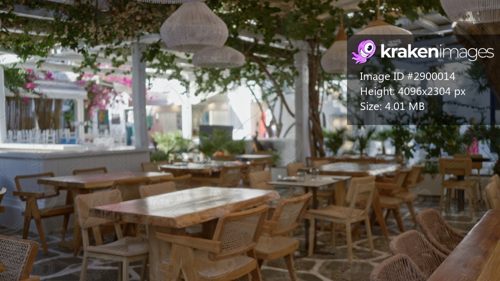 Blurred bokeh dining area with wooden tables, hanging lamps and vines inside a cafe, shallow focus; background backdrop copyspace calm.