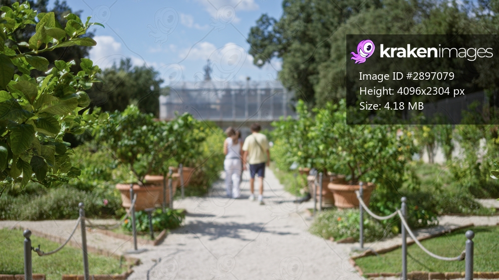 Blurred bokeh garden path with defocused potted trees and distant architecture, park; background backplate copyspace calm.