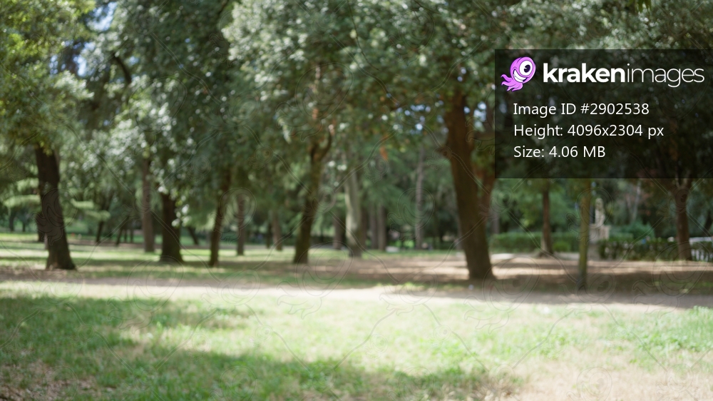 Blurred bokeh view of sunlit defocused trees and grass in a soft shallow focus park; backplate template overlay calm.