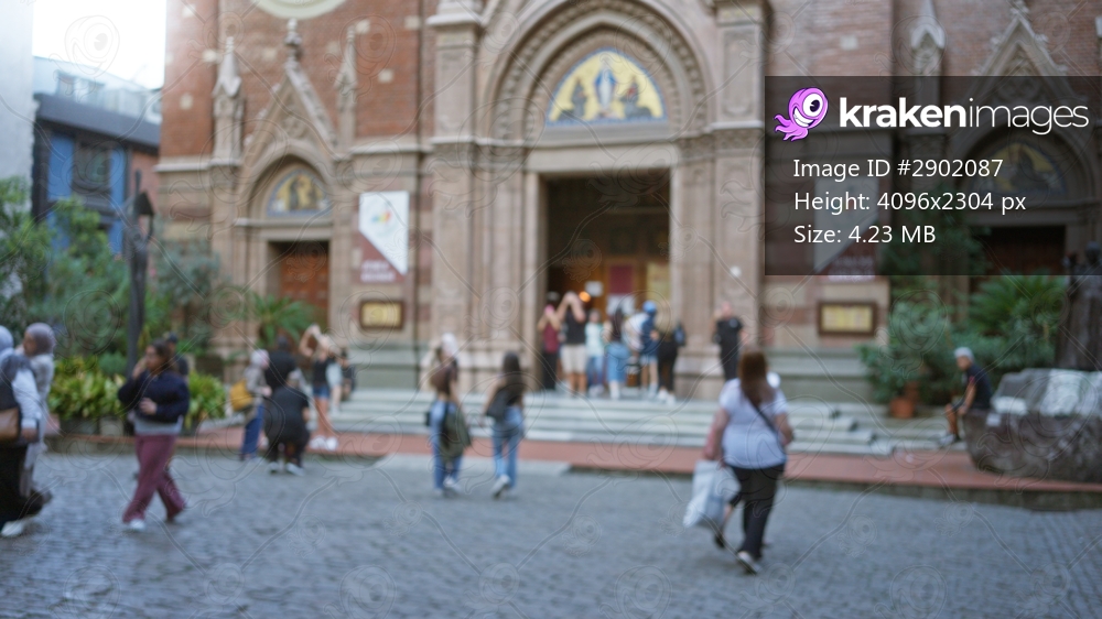 Blurred church facade with shallow bokeh and cobblestone foreground; background backdrop copyspace calm.