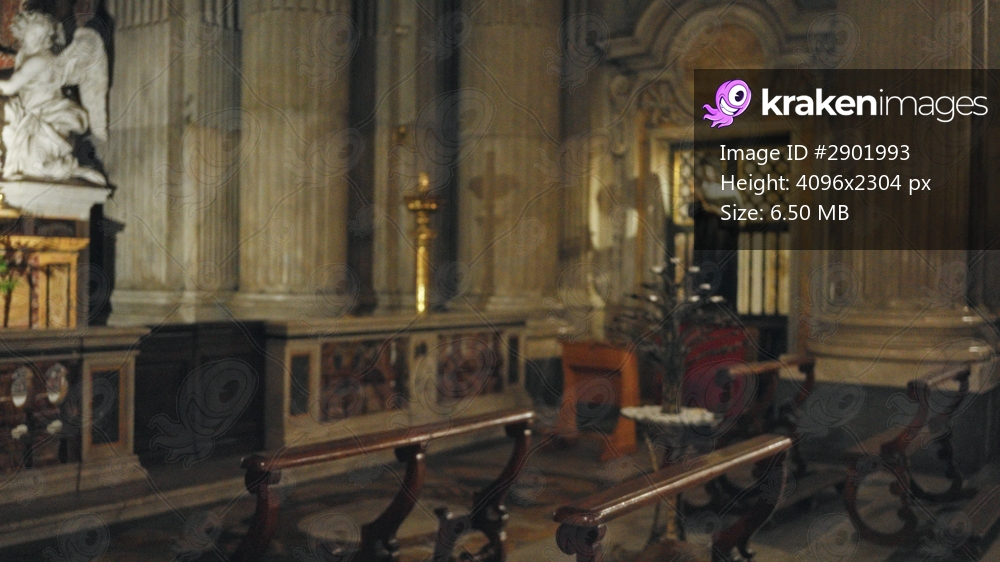 Blurred church interior with shallow bokeh focus showing stone columns, carved altar details and wooden pews, church; background backplate copyspace calm.