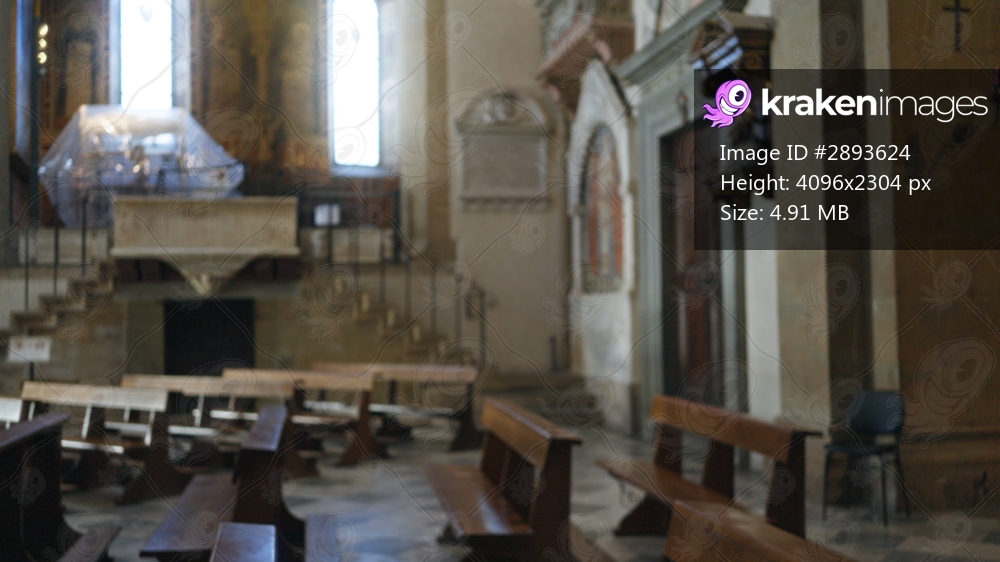Blurred church interior with wooden pews, arched windows and a distant altar in soft defocused focus; backplate copyspace template calm.
