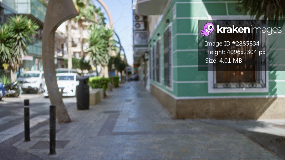 Blurred city sidewalk with shallow bokeh focus highlighting a mint green building facade and paving stones street; background, copyspace, backplate, calm. - Kraken Images