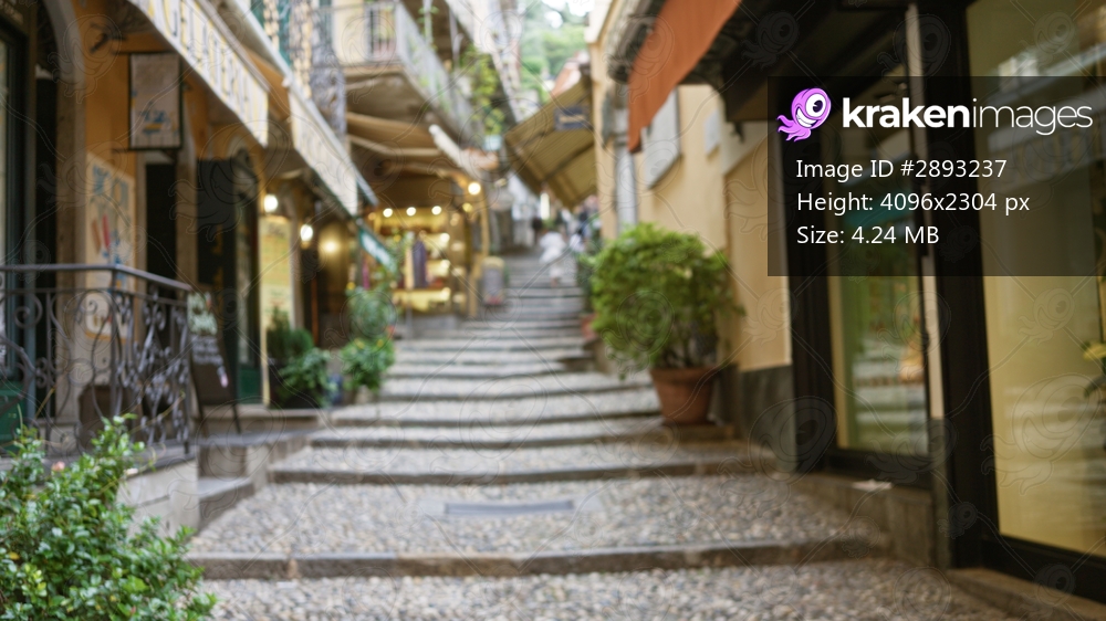 Blurred cobblestone alley with soft shallow bokeh, defocused storefront stairs and awnings in a city background; backdrop copyspace template overlay.