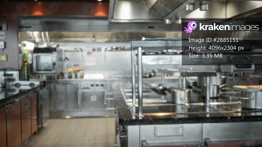 Blurred commercial kitchen interior with stainless steel counters, pots and ovens visible in soft bokeh; background backdrop copyspace calm.