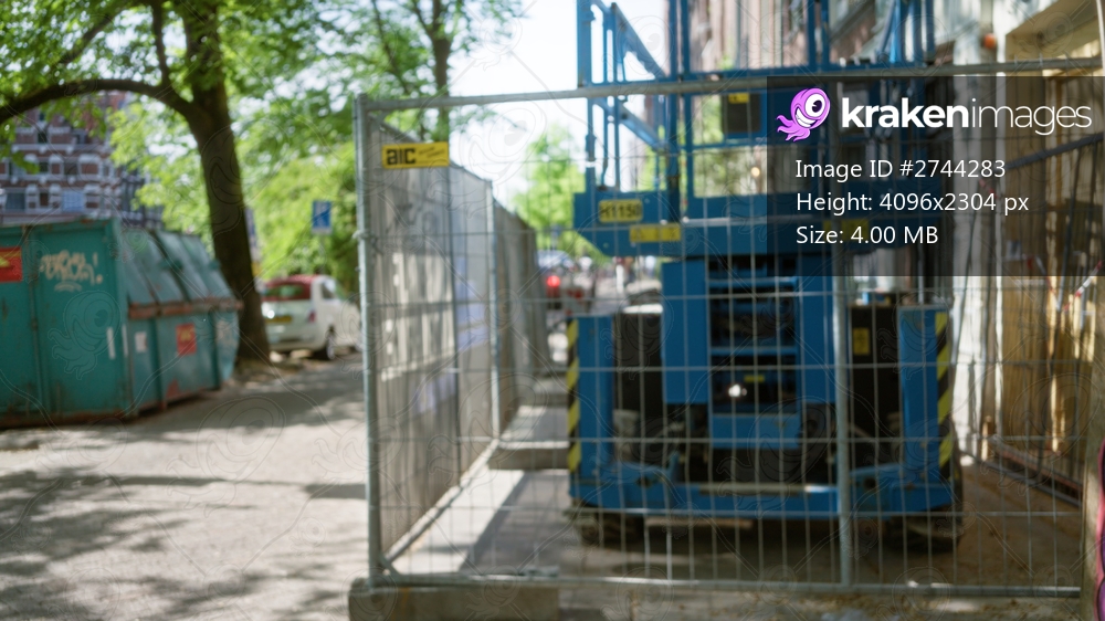 Blurred construction site with a blue lift and metal fence in an outdoor urban setting under dappled tree shade highlighting a busy, sunlit street.