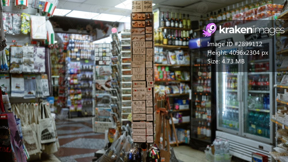 Blurred convenience shop interior with shallow bokeh showing coolers, racks and souvenir displays; background backplate copyspace calm.