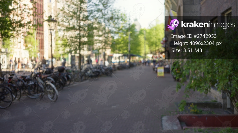 Blurred european city street scene with bicycles in bokeh effect under sunny skies featuring defocused pedestrians, green trees, and buildings with rainbow flags on display. - Kraken Images