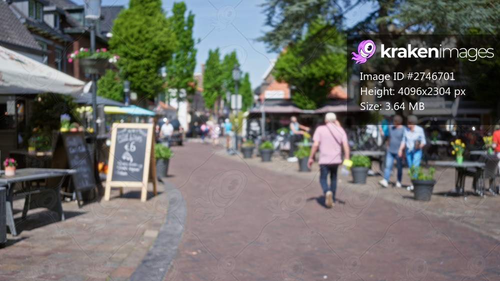 Blurred european street scene with pedestrians walking outdoors, showcasing an urban atmosphere filled with vibrant street life and defocused greenery. - Kraken Images