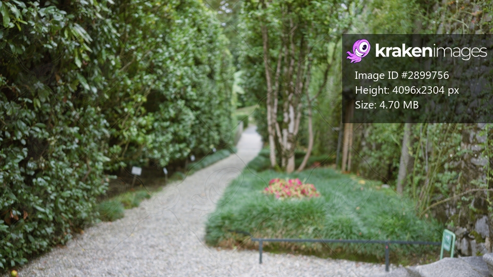 Blurred garden path with shallow bokeh, defocused gravel walkway and soft green hedges garden; background backdrop copyspace calm.