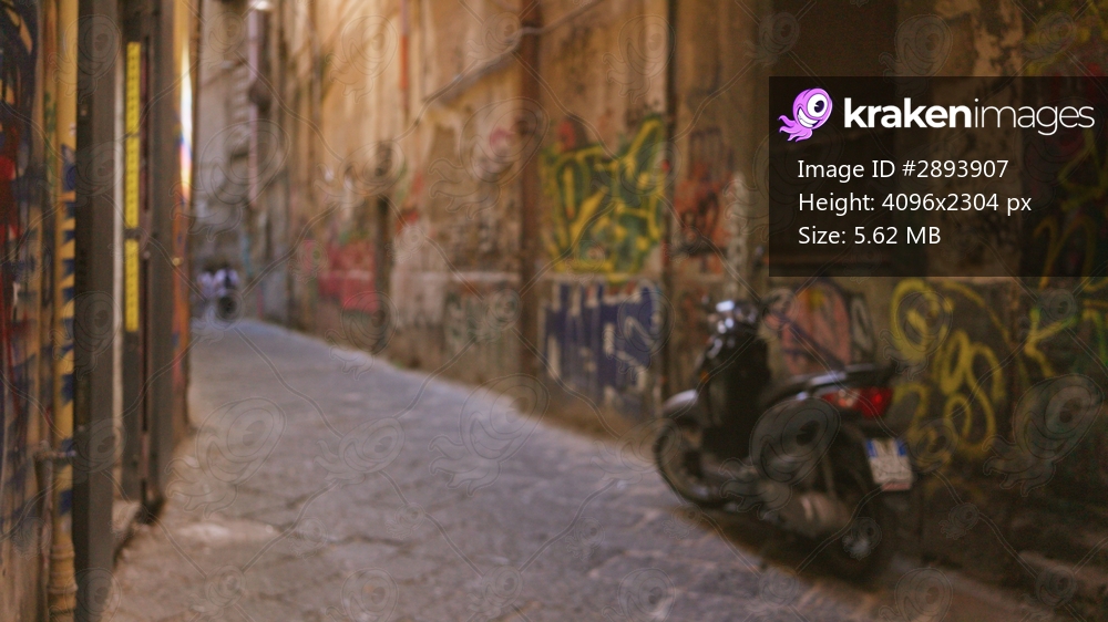 Blurred graffiti lined alley with parked scooter and worn cobblestone paving, shallow bokeh alley; background backdrop copyspace.