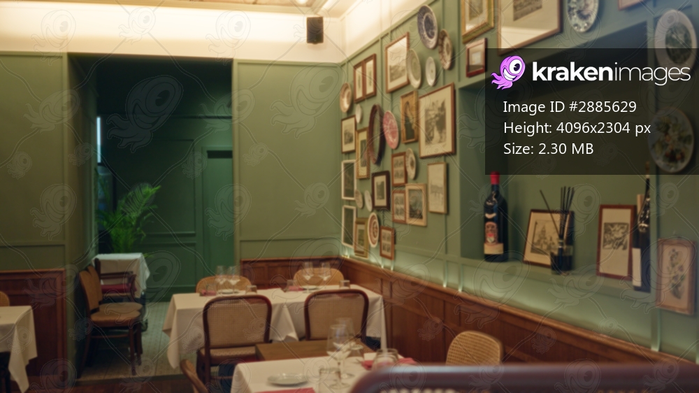 Blurred green cafe interior with tables, rattan chairs and framed plates on paneled walls; background backdrop copyspace calm.