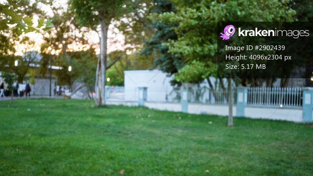 Blurred green park scene with soft bokeh and defocused lawn, trees, path and distant fence at dusk creating gentle muted light and airy feel; background backdrop copyspace calm. - Kraken Images