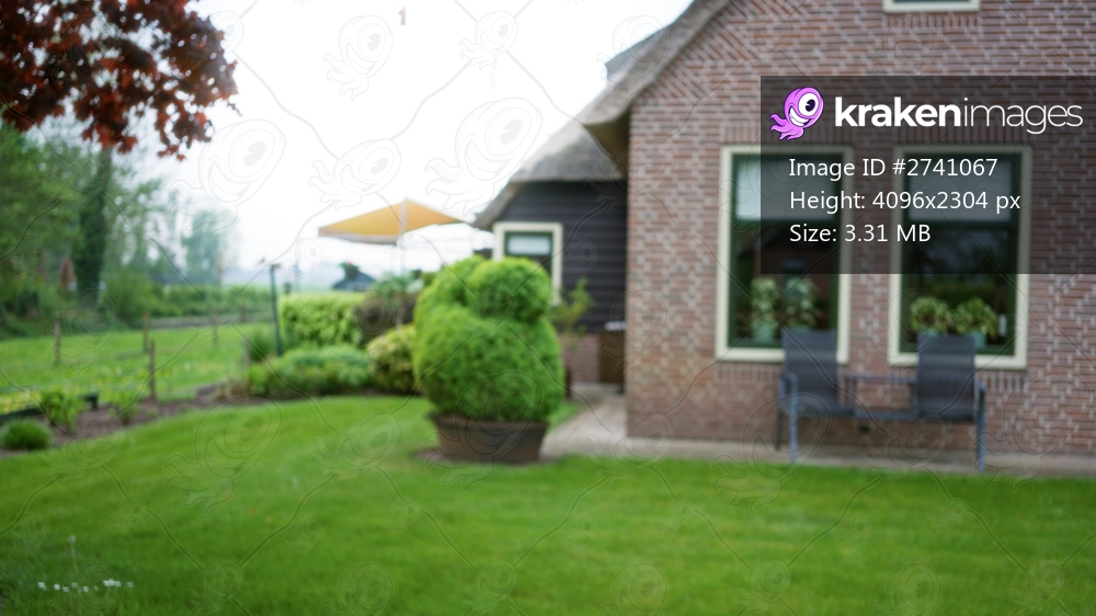 Blurred image of a house exterior with brick walls and green lawn, featuring out of focus trees and defocused garden in the foreground, ideal for real estate themes. - Kraken Images