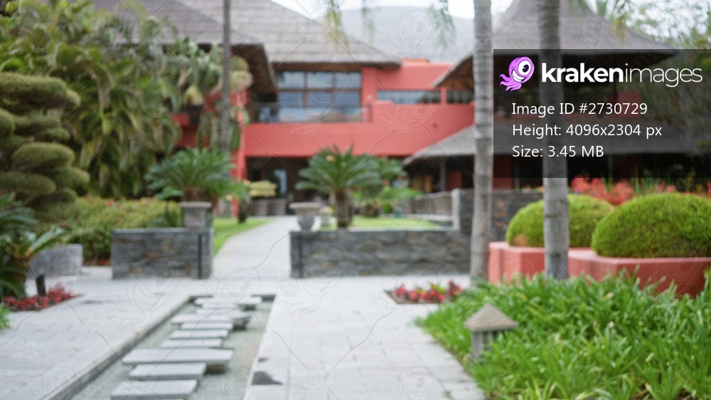 Blurred image of a luxury tropical resort with lush greenery and a red building in the background, creating a serene and inviting atmosphere under a blue sky. - Kraken Images